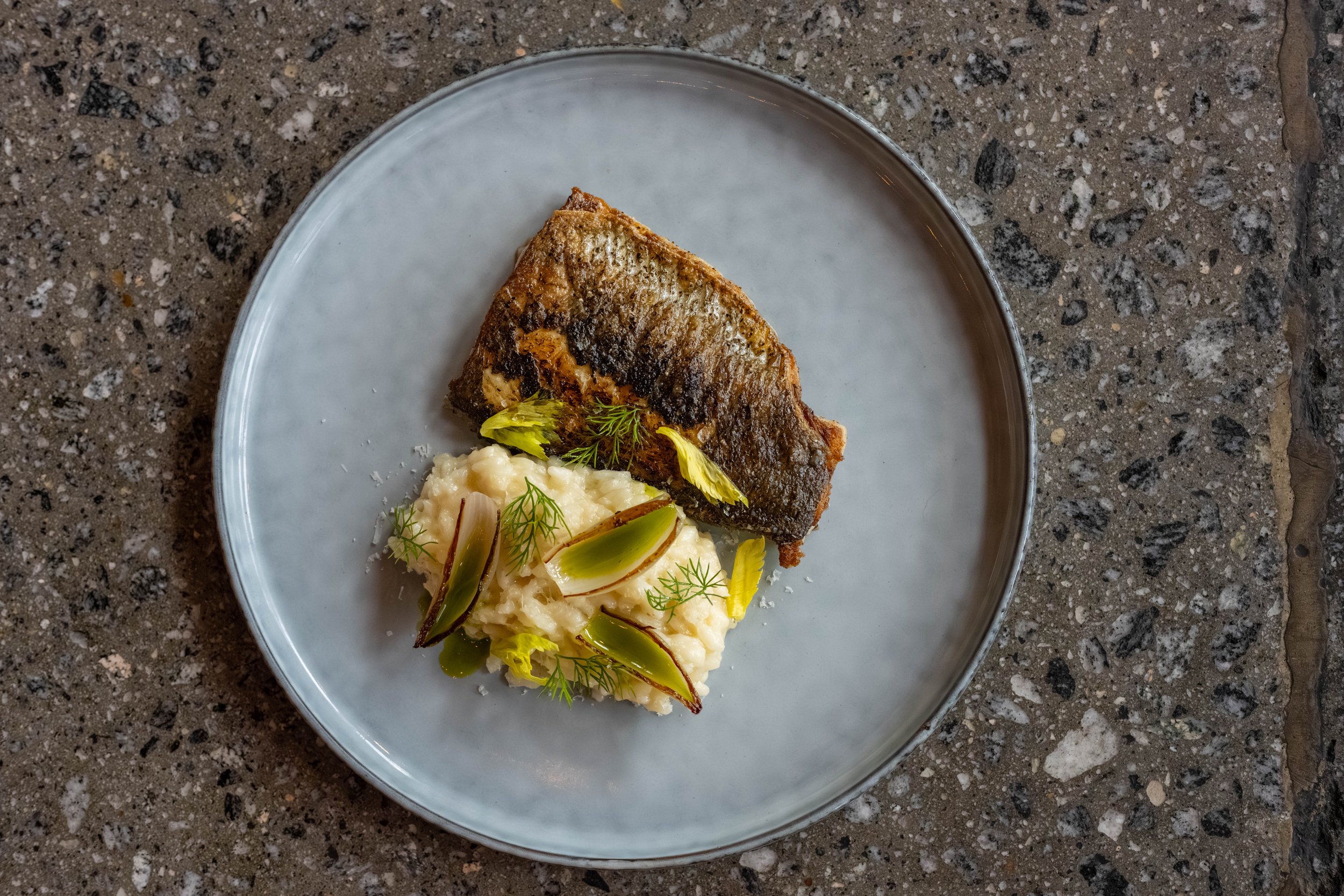 Spoon Risotto into a shallow bowl. Top with Grilled Branzino. Garnish with shallot petals and finish with a drizzle huacatay oil.